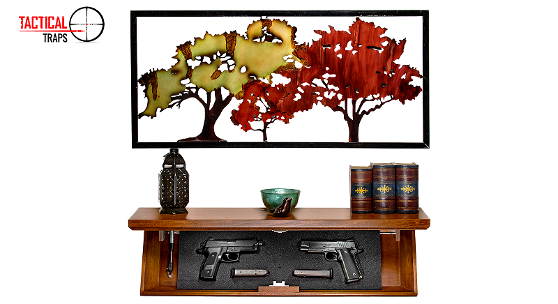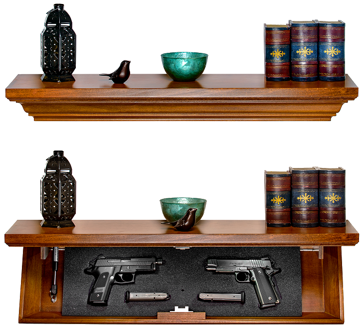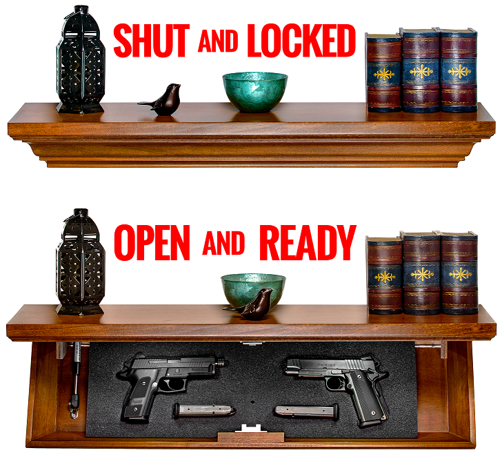What is the SPECIAL EDITION Patriot 35S Tactical Trap? It’s a free floating real wood shelf…equipped with a built in “locking” trap door that quickly and easily conceals your guns, magazines or even valuables in plain sight in anywhere in your house.